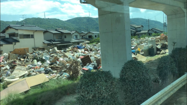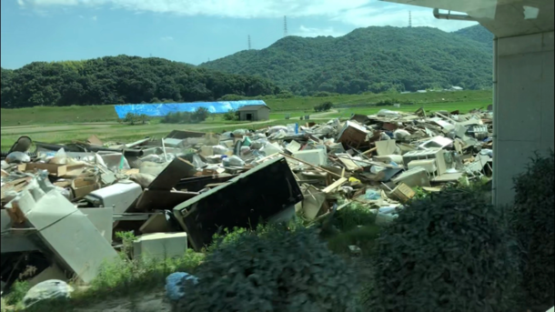 4.バスの車窓から見た真備町の様子。住宅の窓は開け放たれ、人気がなかった。このような家財道具の山がしばらく続いていた。