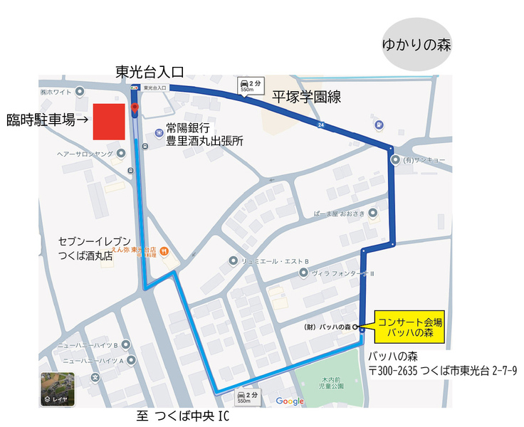 ステファニー・ジョーンズつくば公演(23日(日),14 : 30会場,15 : 00開演)がもうすぐとなりました。バッハの森には自家用車でいらっしゃる方が多いと思います。臨時駐車場は停められる台数に限りがあります。1家族1台、お友達等お乗り合わせでのご来場にご協力をお願いいたします。臨時駐車場は、「常陽銀行 豊里酒丸出張所」の道路を挟んで斜め前になります