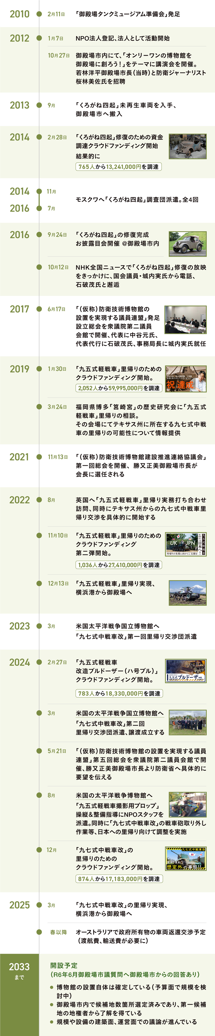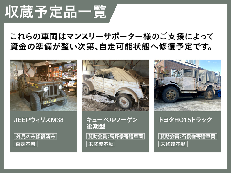活動開始以来、地元御殿場市への公設博物館設置へ向けての働き掛けを続けた結果、2022年には御殿場市長を会長とする「(仮称)防衛技術博物館建設推進連絡協議会」が発足。この間、日本陸軍が開発した幻の四輪駆動車「くろがね四起」修復実現や、「九五式軽戦車」の英国からの里帰りも実現させ、地元でも着々と認知が進んでいます。2023年度は公設博物館実現に向けた具体的な動きがみられると感じており、今回マンスリーサポーターを広く募集させて頂く運びとなりました。
