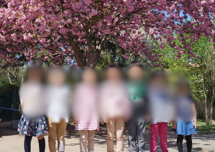 日本人学校は海外にある学校ですが、日本と同じ4月に新年度がスタートします。ハンガリーも日本と同様の四季があり、この桜の木の下で、たくさんの子どもたちが入学や進級を喜びいっぱいに迎えていました。また、休み時間は、ヴィラ―ニョシュ校と日本人学校の子どもたちが元気に仲良く遊ぶ姿も見守ってくれました。