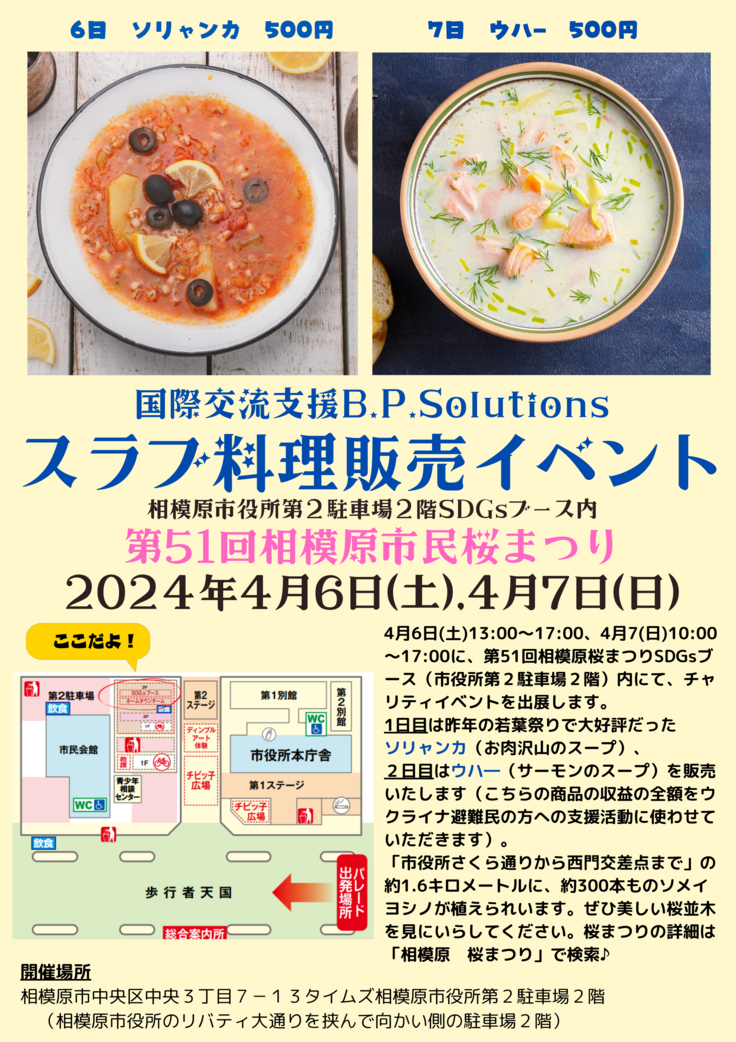 1日目は昨年の若葉まつりでも大好評だったウクライナ料理ソリャンカ(お肉が沢山入ったスープ)、2日目はスラブ圏内で広く親しまれているウハ―(サーモンのヘルシーなスープ)を販売いたします。(※こちらの商品の収益の全額をウクライナ避難民の方への支援活動に使わせていただきます)。