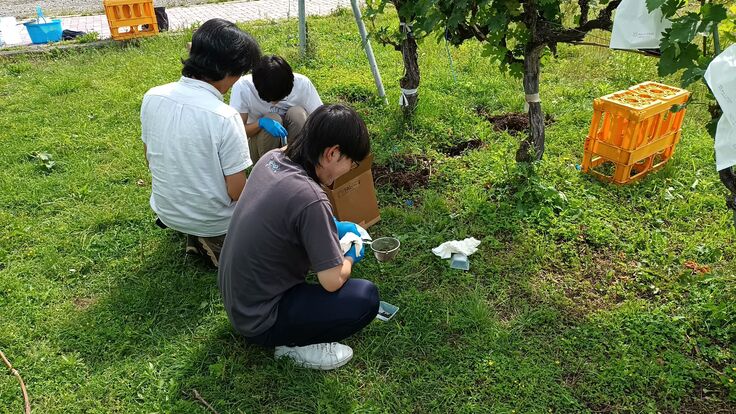 叢生栽培(草生栽培)を導入している弊センターの圃場では、下草とブドウ樹と微生物が織りなす複雑な土壌環境が広がっており、その中で何が起きているのかを科学的に解明しようとしています。