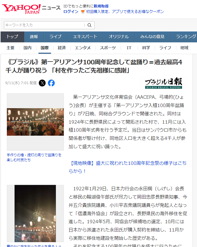 9月7日(土)に行われた第一アリアン入植100周年盆踊りですが、ブラジル国内ではブラジル日報様が記事やインスタグラム等で発信をしてくださいました。また、遠く日本でも、長野県の長野朝日放送様で特集番組として放送してくださいました。