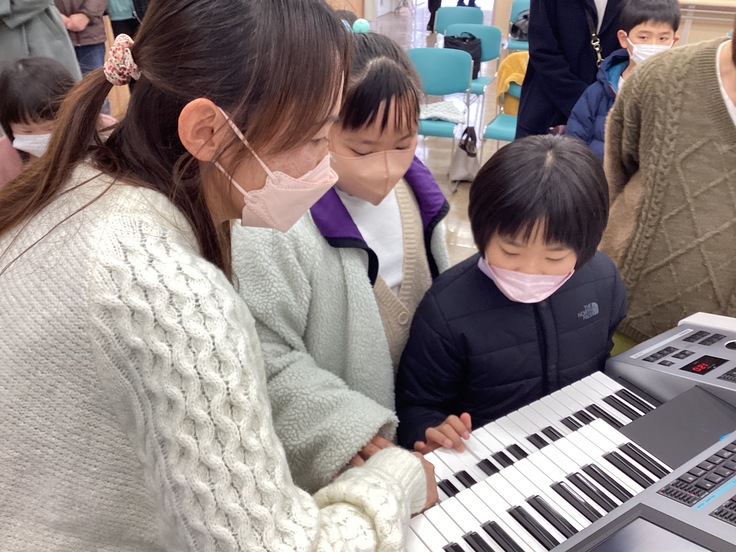 お友達のエレクトーンの真希先生は子どもたちとの触れ合いに大感激。子どもたちはいろいろな音の出るエレクトーンに大感激。真希先生も「とっても楽しかった!」と喜んでくださいました。