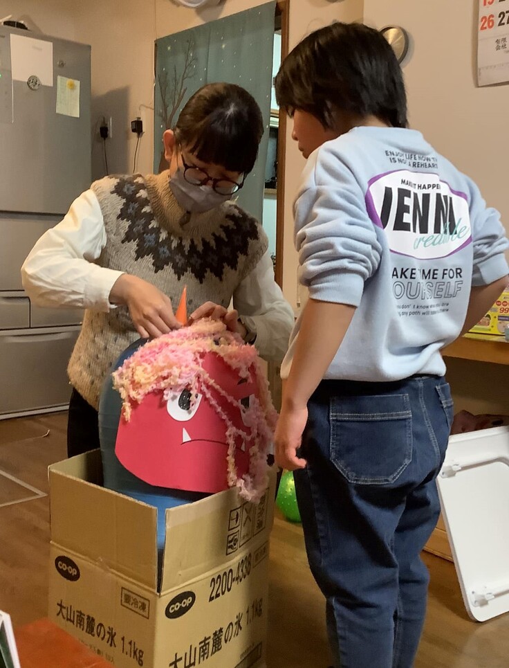 2月3日の節分では、Bremenの子ども達も豆まきを行いました。鬼のお人形を作って「鬼はそとー、福はうちー」。