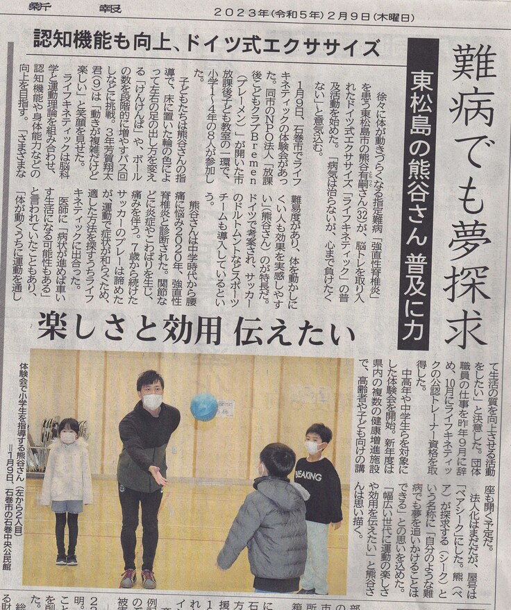 。ドイツ式エクササイズ「ライフキネティック」をご指導いただきました熊谷有嗣様をご紹介する記事です。熊谷様は徐々に体が動きづらくなる難病を抱えながら、「生活の質を向上をさせる」ライフキネティックの普及に取り組んでおられます。子どもたちもとても良い経験ができたようです。