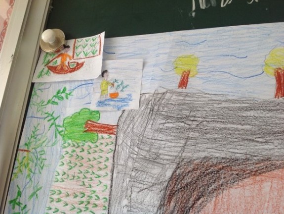 ・2013年11月第1回目の授業で子どもたちが描いた「私の故郷」の絵について、日本のボランティアンさんから挙がった感想・質問を発表する。