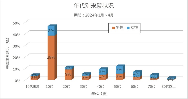 ベースボール&スポーツクリニックへお越しになる患者様の約70%がスポーツをされている方々であり、その半数以上が野球選手です。野球をはじめ、さまざまな競技アスリートの方々にご利用いただいております。また、患者様の約45%は10代の若い世代であり、若年層の患者様が多くいらっしゃるのも特徴です。