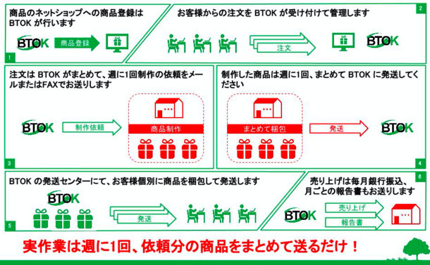 ◎注文、個別発送業務なども代わりに行うので、施設は週に1回まとめて、BTOKに商品を送るだけ!