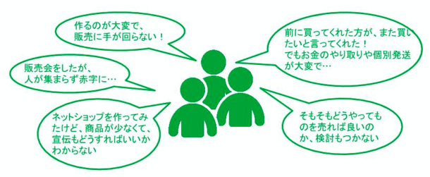 障がい者施設をたずねてみると、「ネットショプは興味があるけど、現状でも忙しくて商品を個別に発送する時間も人もさけない」「そもそもパソコンが苦手でよくわからない」などの声がありました。現場で働く職員の方々に聞いてみると施設によって理由はさまざまですが、商品を自分たちで作ることは出来ても、その販売となると、ネット販売までは手が回っていないという現実があるようでした。