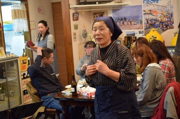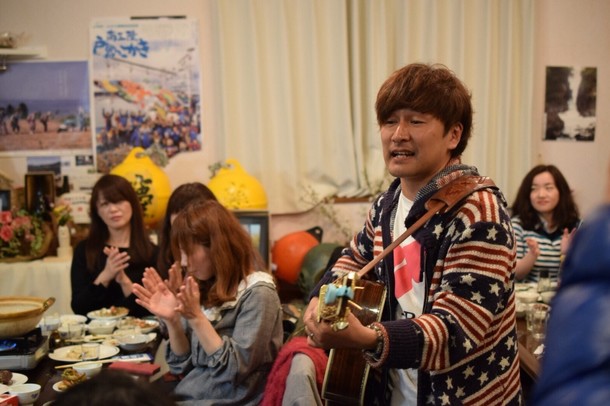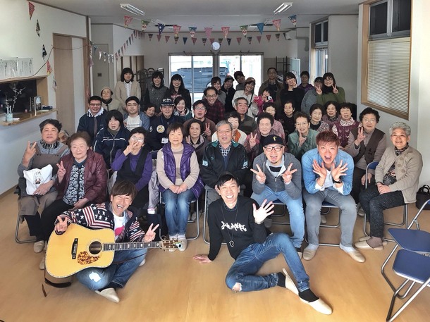 この後、一行は、南三陸町「町営志津川東復興住宅」の集会場を訪問、ここでトーク&音楽ライブを行いました。