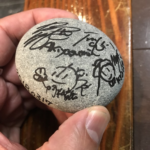 写真:南三陸の沿岸で拾った石にサインを書いて