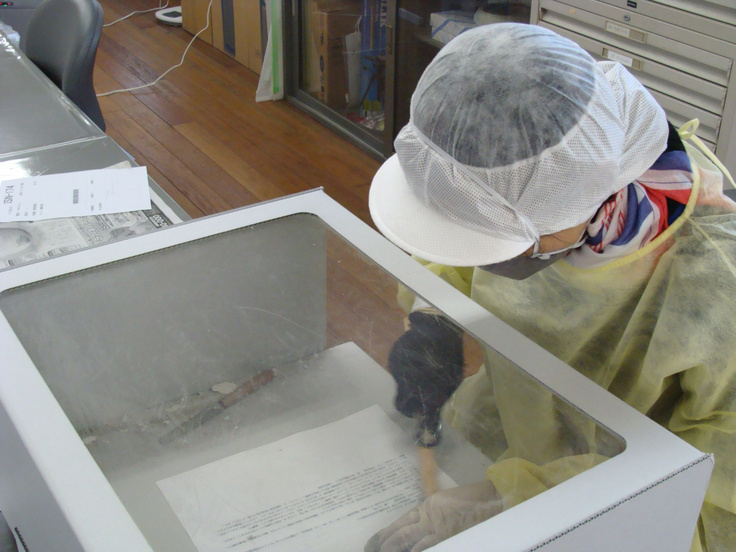 次に立ちはだかる問題は、津波の泥やカビ等をクリーニングするというものです。これには、NPO法人書物の歴史と保存修復に関する研究会(書物研)の皆さんの献身的なご協力をいただきました。
