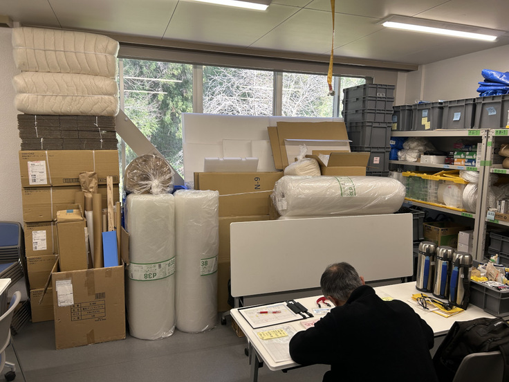 午前の作業を終え、しばらく昼休憩をとった後、午後は一時保管場所内に運び込まれた資料の整理を行います。