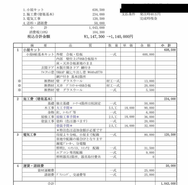 庭に立てる部屋、本文にも載せています見積書(概算です)