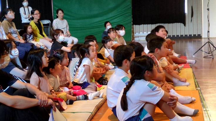 開演前に担当の先生が「今日初めて人形劇を見る人手を上げて」というと、子どもたち全員、そして子どもたちの後ろに座っていた地域のみなさん全員が手をあげました。