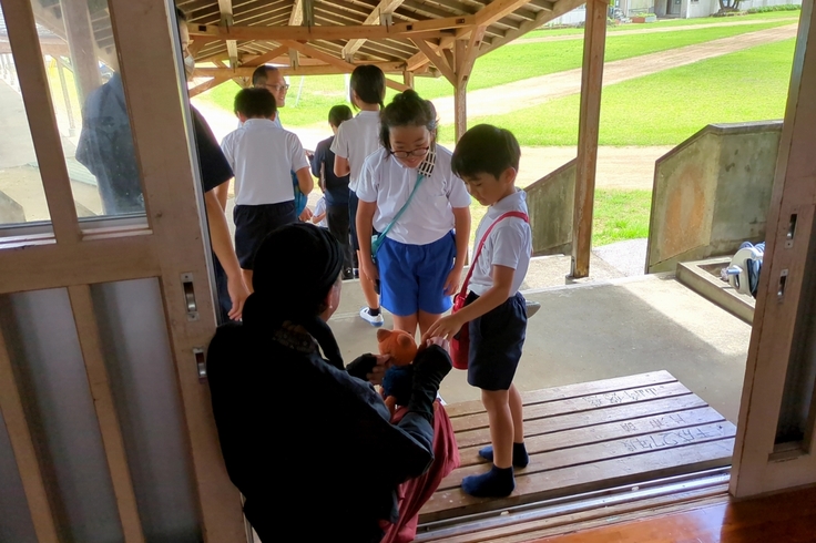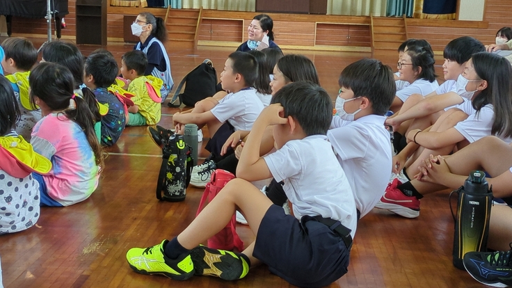 全校児童15名の学校です。1人欠席があったのですが、学校が近くの保育園に呼びかけをしていて16名の園児たちも観に来てくれました。