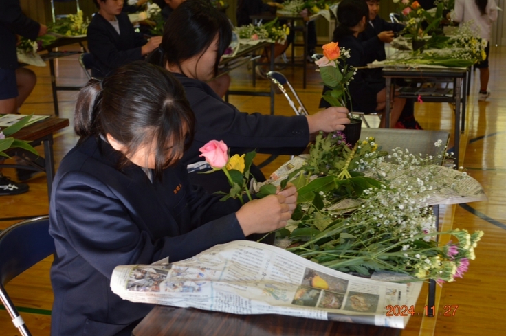 「大切なのは花の命を生かすことです。花の特徴をしっかり見ること。そして、今から咲こうとする蕾もそして枯れようとする枝もすべて命がある。それを感じてください。」という講師のお話しを真剣に聴き入っていました。
