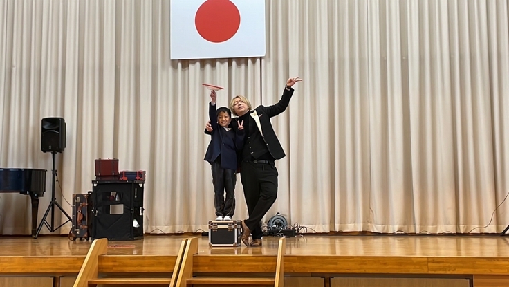子どもたちが体育館に入ってくると、舞台の前でK@ITOさんがマジックを始め、子どもたちは「なんかやってる!」と、立ったまま不思議なトランプのマジックを凝視!先生方も「えっ〜」という感じでみていらっしゃいました。