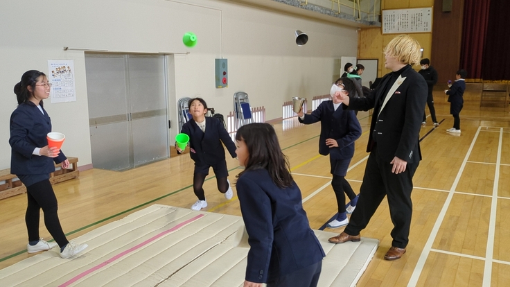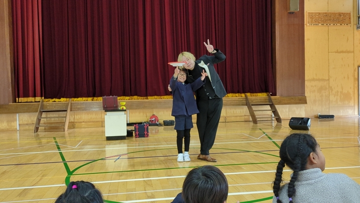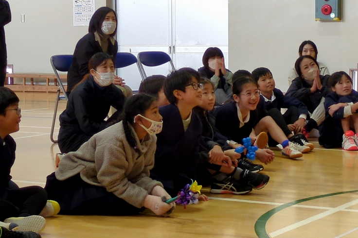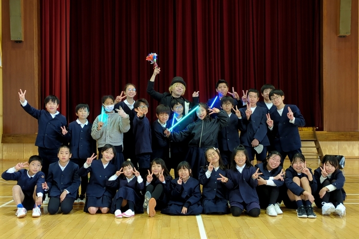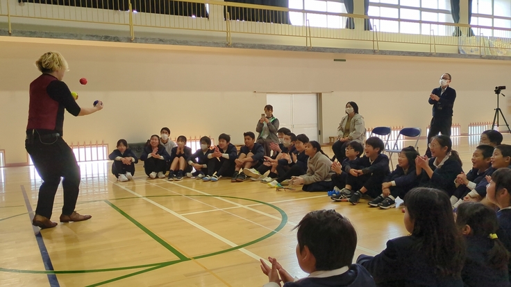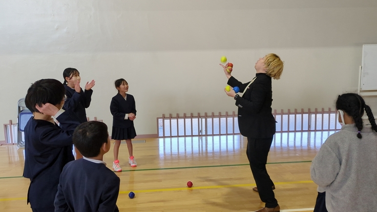 1月21日(火)、全校児童26名の南種子町立西野小学校(種子島)でJACKプロジェクトのK@ITOさんによるパフォーマンスショーとジャグリング体験がありました。
