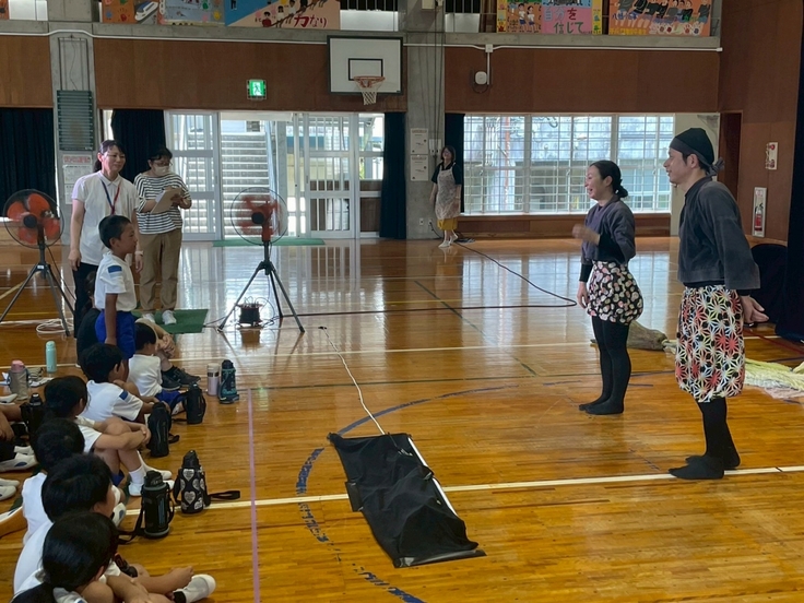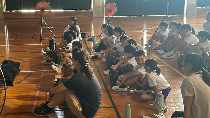 朝から熱中症警戒アラートが発令されていて、学校内からかき集められた7台の扇風機に囲まれての実施でしたが、子どもたちは手元に置いた水筒を時折口にしながらも集中力は切らさずに見入っていました。