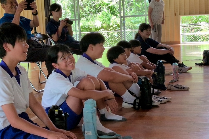 連日35度超えの伊佐市、前日の雨で少し気温が落ち着いた体育館でしたが、それでも蒸し暑く、大型の扇風機5台と小型4台がフル回転し、役者さんは熱演で汗だくでした。