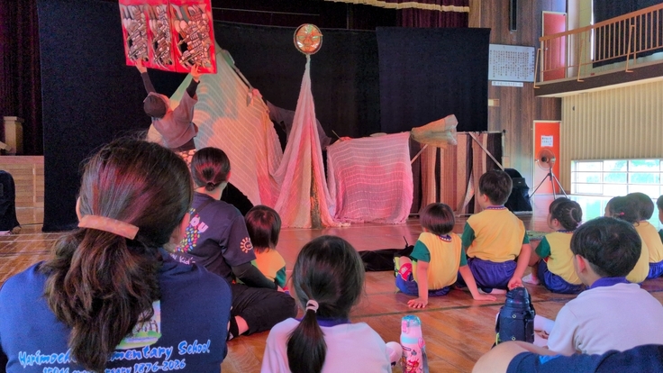 伊佐市の南西(さつま町との境)にある針持小学校は全校児童6人で、すぐ近くの紅葉こども園の7人の園児も参加して、ゆめみトランクさんの「かぐやひめ」公演を観賞しました。
