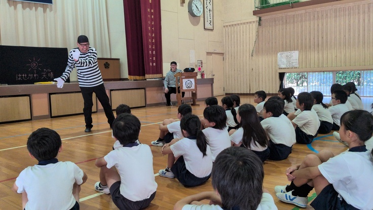 10月15日(水)は全校児童34名の鹿屋市立祓川小学校ではせがわ天晴さんと坪内晋二さんによる「パントマイム体験」が行われました。