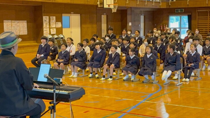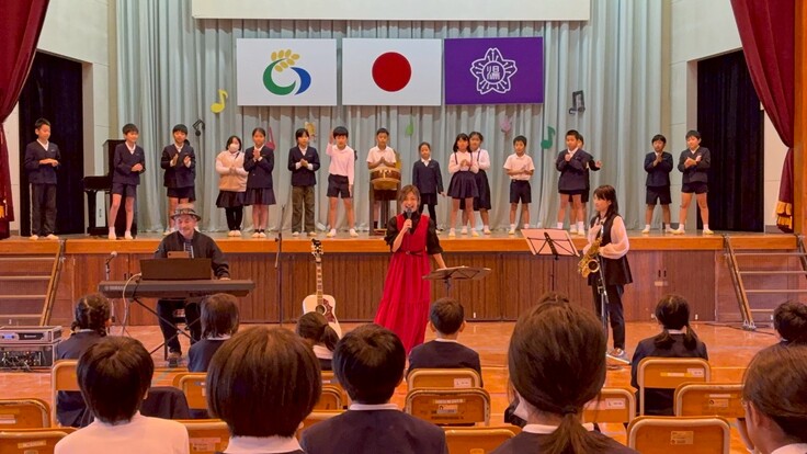全員で校歌を歌ったあと、バラード調にアレンジされた校歌をボーカルのゆみかさんが歌うと子どもたちはちょっとビックリ顔!バラード調の校歌も気持ち良さそうに歌っていました。