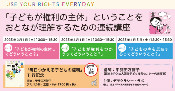 本書籍の出版を記念して、デモクラシー・ラボさんの主催による「「子どもが権利の主体」ということをおとなが理解するための3回連続講座」が開催されます!講師は、代表理事の甲斐田万智子が務めます。