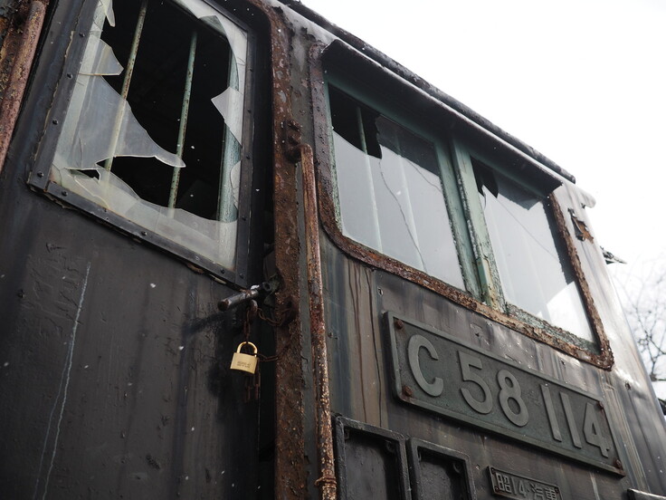 約半世紀にわたり保存されてきたC58 114ですが、長年整備を行われること無く屋外での放置状態が続いたため、塗装は剥がれボロボロの姿になってしまっております。
