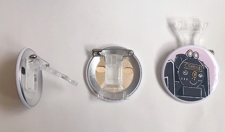 可愛らしいシゴハチさんのイラストとSLの動輪のデザインで背面にスタンドも付いています。角度もお好きな角度で変えれて、通常の缶バッジとしてピンを使用してバックや帽子等に付けることも、スタンドを使用してお好きな所に飾ることもできます。スタンド本体には丸穴もあるので紐をつけてキーホルダーとしても良いですし、スタンドを展開し丸ピン等で壁やコルクボードに挿し想い出の写真等と一緒に飾る事もできる素敵な品です。
