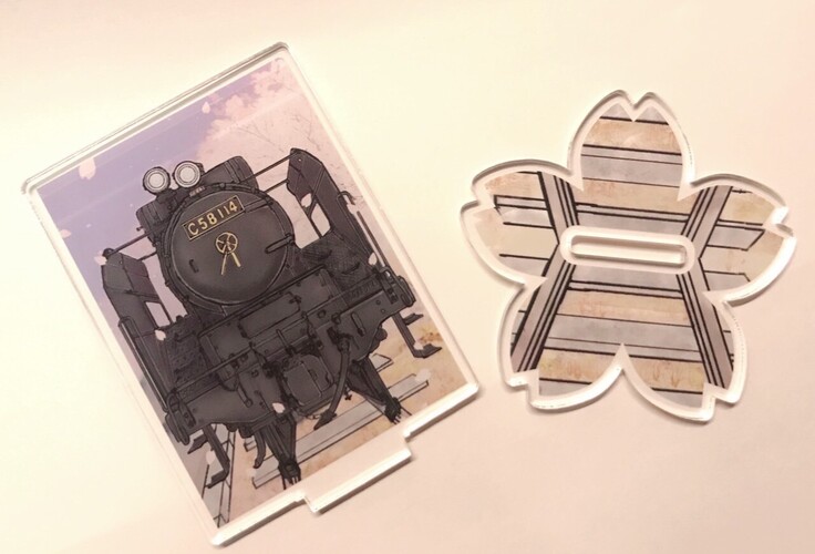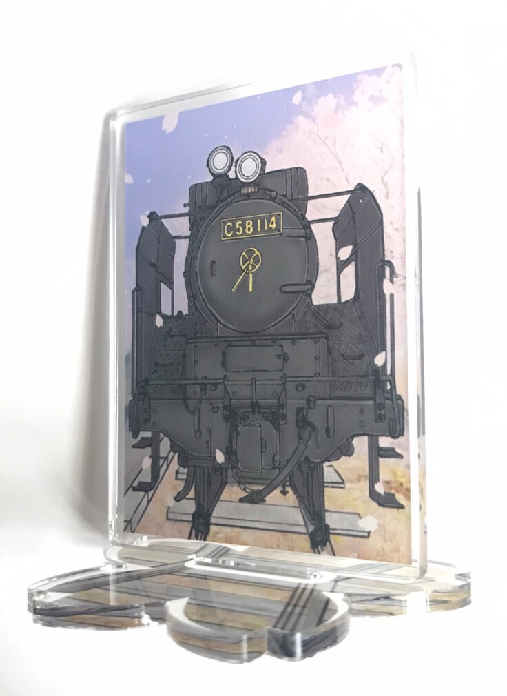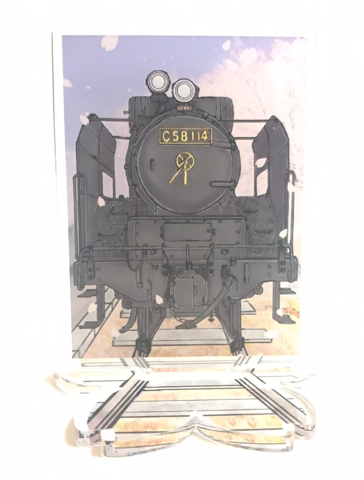 アクリルスタンドはC58 114の正面と満開の城山の桜が咲き誇っている様子をイメージしてデザインしており台座は桜の形をした仕様のアクリルスタンドとなっております。