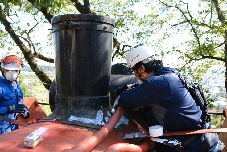 煙突周りの穴は補修材でしっかり塞いでいきます!
