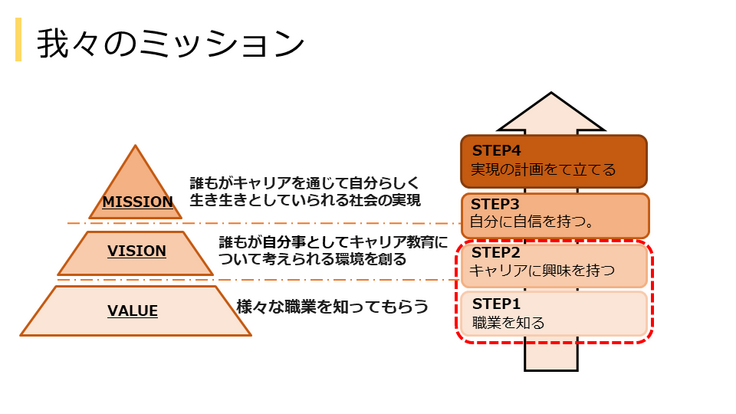 カンボジアにある様々な課題の中で、私たちが最も注目したのは、「どうすれば地方の子どもでも職業選択の幅を広げられるか」 つまり、子どもたちの【キャリア教育】です。地方に住む子どもたちは、教育環境やインターネットの整備の遅れ等から、職業に関する情報が限定的であり、また仕事に対するモチベーションも低いことがわかりました。(私たちがオンラインでの聞き込みをしたところ、)具体的には、両親や親せきの職業しか知らず、家業や地元の企業での就職を希望、またすぐに仕事を辞めても構わないという仕事に対するモチベーションが低い等の子どもたち多いことがわかりました。