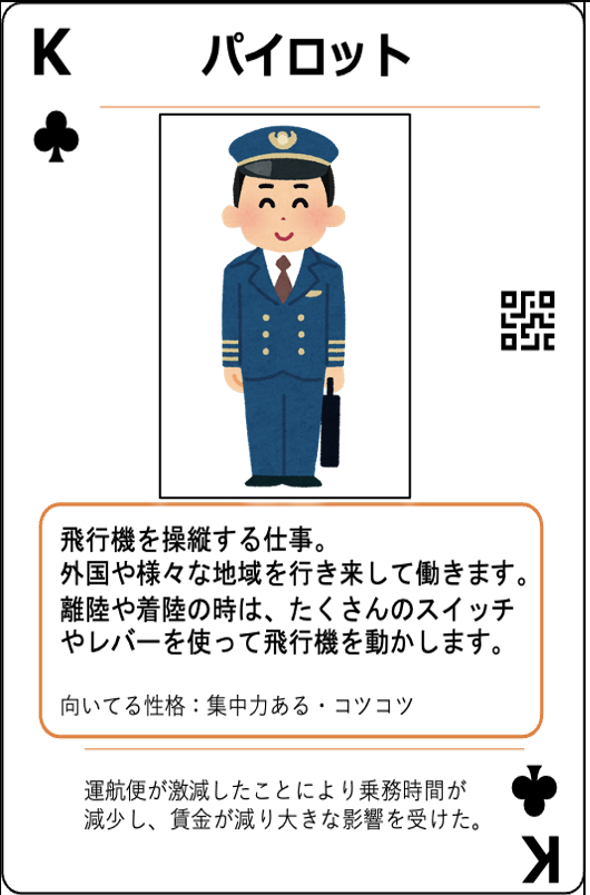 トランプに52種類の職業を記載しその職業を知らなくてもイメージができるようにイラストや写真を使い、職業の解説や向いている性格など、興味を持ってもらえるような工夫を行っています。また、QRコードを読み取り、動画などのオンラインコンテンツで職業の紹介ができるシステムを構築したいと考えています。