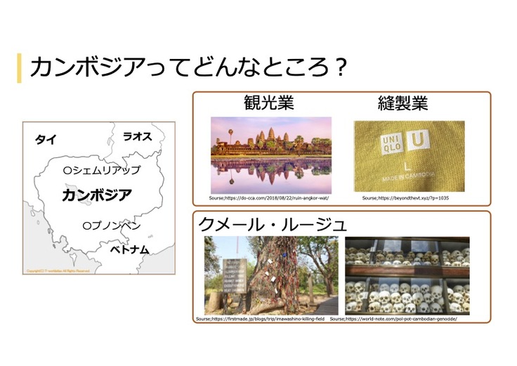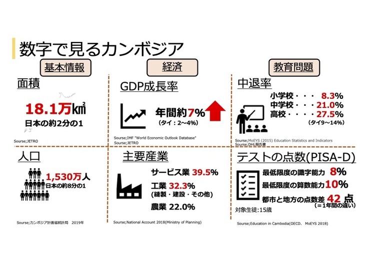 カンボジアは東南アジアのタイの南部にあり、日本の国土の約半分に人口1530万人が暮らす国です。観光が主産業でアンコールワットが最も有名な観光地として知られています。1970年代にはル・ポト政権による「クメール・ルージュ」という過激な共産化によって、国民の4分の1にあたる180万人ものカンボジア人が殺害されました。教員や医師、学生などの知識人も多く含まれており教育制度は崩壊してしまいました。