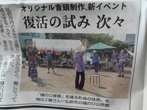 町内に1500年代に建立された熊野宮神社や、岩木山、茜橋のこぎん刺しの模様、歴史などを歌詞に盛り込み、『明るく楽しく元気よく!』という町内会のスローガンをメッセージとして、作曲、アレンジをさせていただき、歌好き、踊り好きな先輩方、子供達とレコーディングして、8月18日の本番で一緒に踊りました!