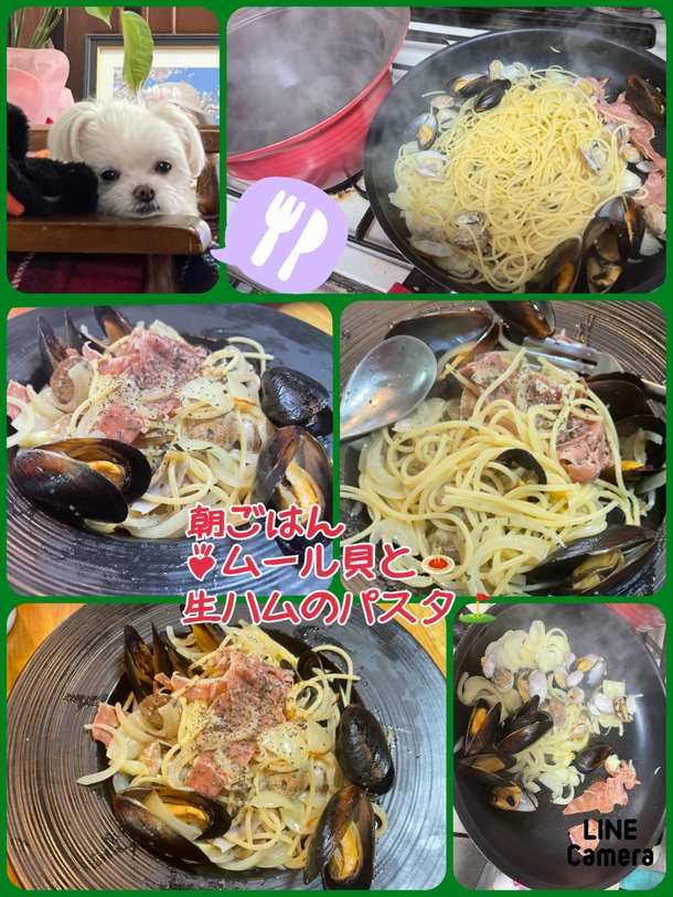 食材もありそう〜、で、ムール貝、あさり、生ハムのパスタ作りました。(朝メシ(o^^o))