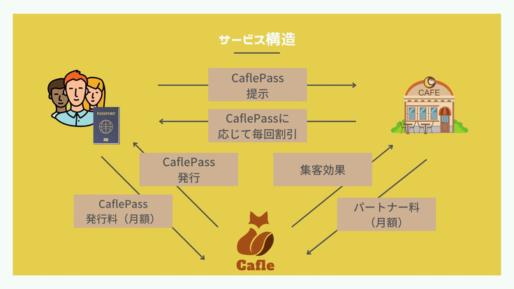 Cafleのパートナー店で使えるCaflePassを発行することで、ユーザーはカフェ・喫茶店をお得に利用できる、カフェ・喫茶店側は集客効果による売り上げなどの向上を見込むことができます。