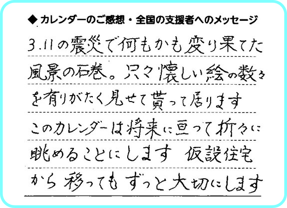 昨年、カレンダーをお届けした方より、たくさんの感想や、全国の皆様へのメッセージを頂きましたので、少しづつここで紹介させて頂いていきます。
