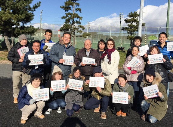(矢本運動公園にて自治会長様と配布メンバーで)