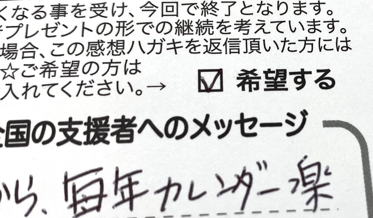 いつも、カレンダーに同封する「感想ハガキ」の項目に、