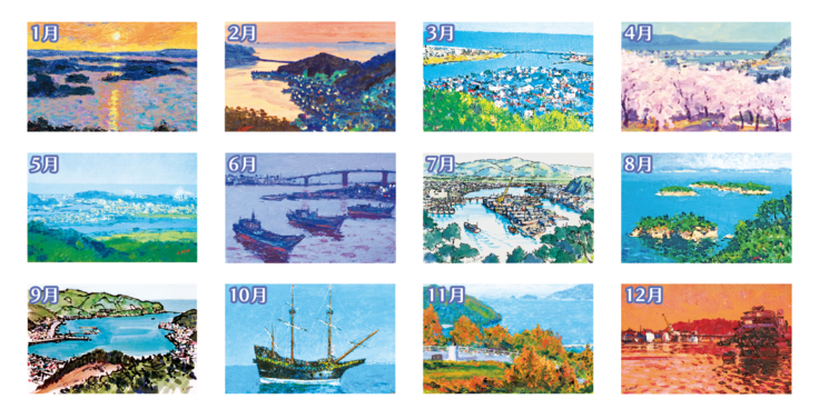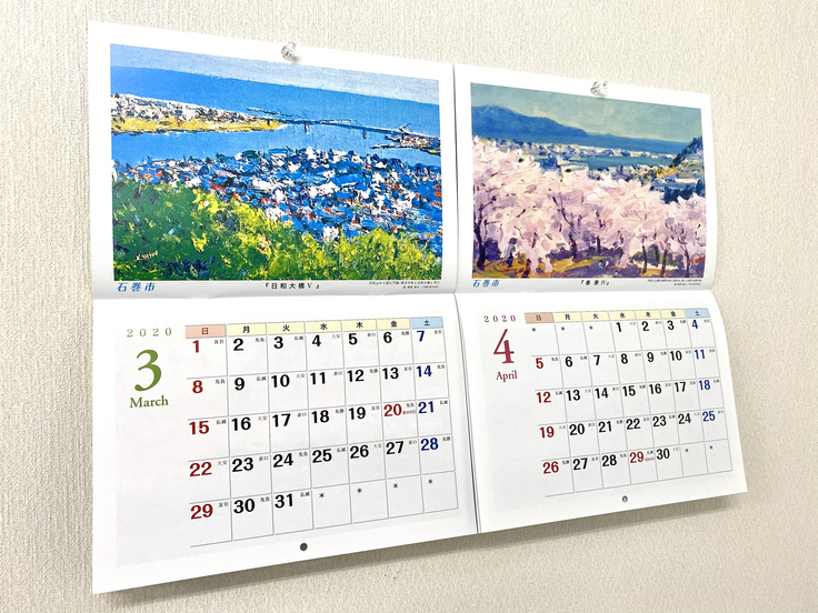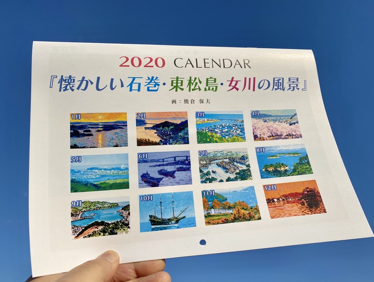 2019版『懐しい東松島・石巻の絵画カレンダー』又は『懐しい女川の絵画カレンダー』の絵画6点バージョン(絵画1点に2ヶ月表示)を、年内に送付するコース。<※2種類のうちどちらかをお選びください。(写真は東松島・石巻verです)>