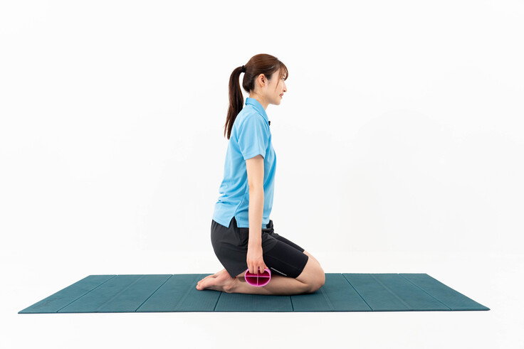 2)つぎに膝の裏にはさんで、左右に軽く体重移動を5秒