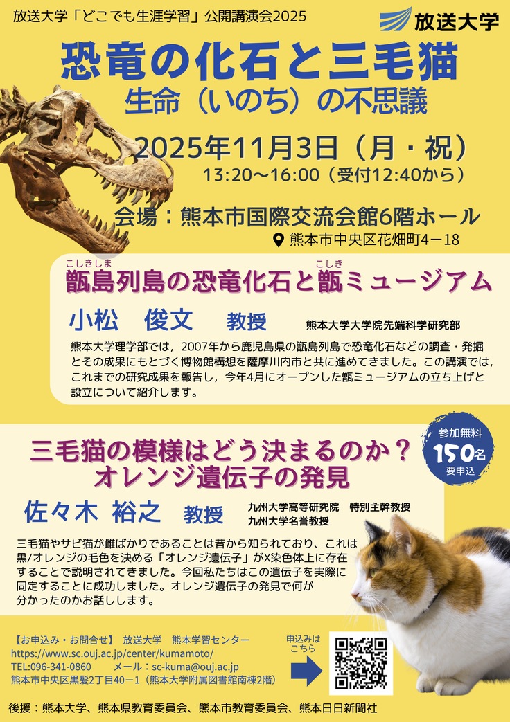 ところで、代表者の佐々木が放送大学のどこでも生涯学習公開講演会に登壇することになりました。11月3日、場所は熊本市になりますが、ご都合がつく方はぜひご来場ください。同日は、恐竜の化石に関する講演もあります。詳しくは下記をご覧ください。