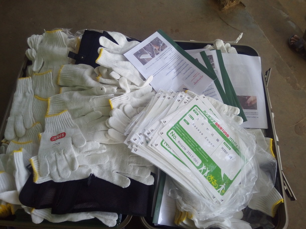 修理するときに手を怪我しないようにするためのものです。軍手はもちろん安価なものが現地で売っていますが、実はこだわりがあって日本から持参しています。友達の出口さんが日本で軍手の生産をしています。彼の会社(泉州作手紡績)のホームページはこちらです。だから純日本製の軍手。