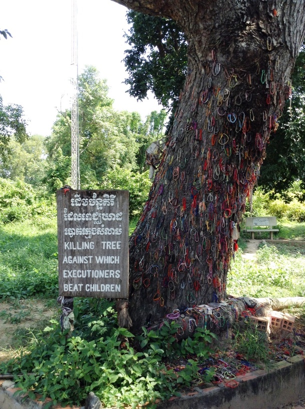 そうした悲しい歴史を後世に語り継ごうと、プノンペンにはキリングフィールドやトゥルースレン虐殺博物館があります。初めてカンボジアを訪れたとき、両方行ってきました。この写真はそのとき撮った写真。キリングフィールドにある悪名高き「虐殺の木」です。泣き叫ぶ母親の前で小さな子どもの足を持ちこの木に打ちつけて殺しました。その後母親も殺して埋めたのです。木にかかる大量のミサンガは訪れた人たちの平和を祈る気持ち。殺された母子に対する祈りです。
