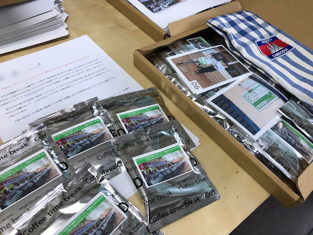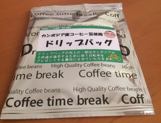 こちらがカンボジアのモンドルキリ・パイリン両地区で栽培されたコーヒー豆で作られたドリップバッグ。写真のラベルは販売用になっていますが、お礼のメッセージを記したラベルを貼って30個お送りいたします。