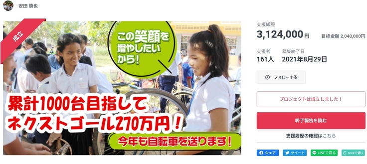 私は2015年にカンボジアを訪問したことをきっかけに、現地の子どもたちのために奨学金支援を始めました。そこからもっとできることはないかと考え、現地の子どもたちに自転車を届けるプロジェクトを2016年に始めました。Readyforさんには2017年からお世話になっています。過去5回行ったクラウドファンディングでは、たくさんの方からご支援をいただきました。本当にありがとうございます。